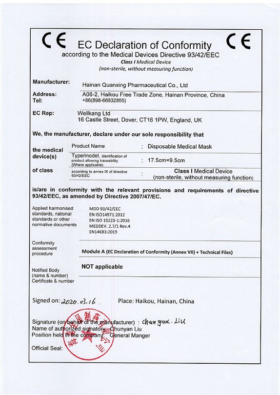 與此同步,正式啟動(dòng)醫(yī)用口罩(非無(wú)菌)的CE認(rèn)證工作,質(zhì)量部門牽頭認(rèn)真研讀、解析歐盟醫(yī)用口罩的相關(guān)法規(guī)和注冊(cè)要求,多部門齊心協(xié)力、分工合作,按ISO13485醫(yī)療器械質(zhì)量管理體系標(biāo)準(zhǔn)完善我司醫(yī)療器械管理體系;委托第三方機(jī)構(gòu)按照歐盟醫(yī)用口罩標(biāo)準(zhǔn)EN14683-2019檢驗(yàn);根據(jù)歐盟醫(yī)療器械93/42/EEC指令進(jìn)行注冊(cè)準(zhǔn)備工作和自我符合性聲明。